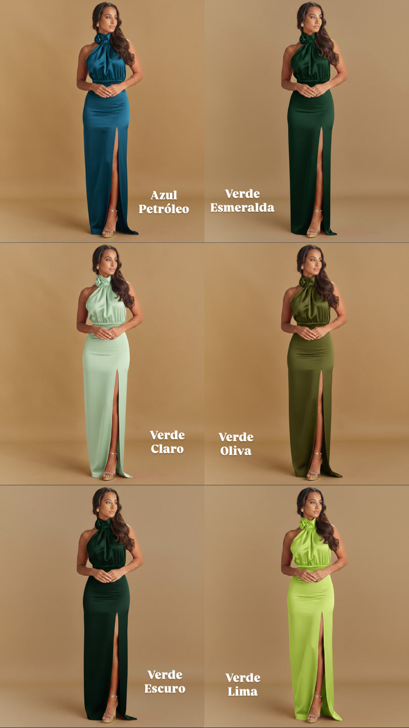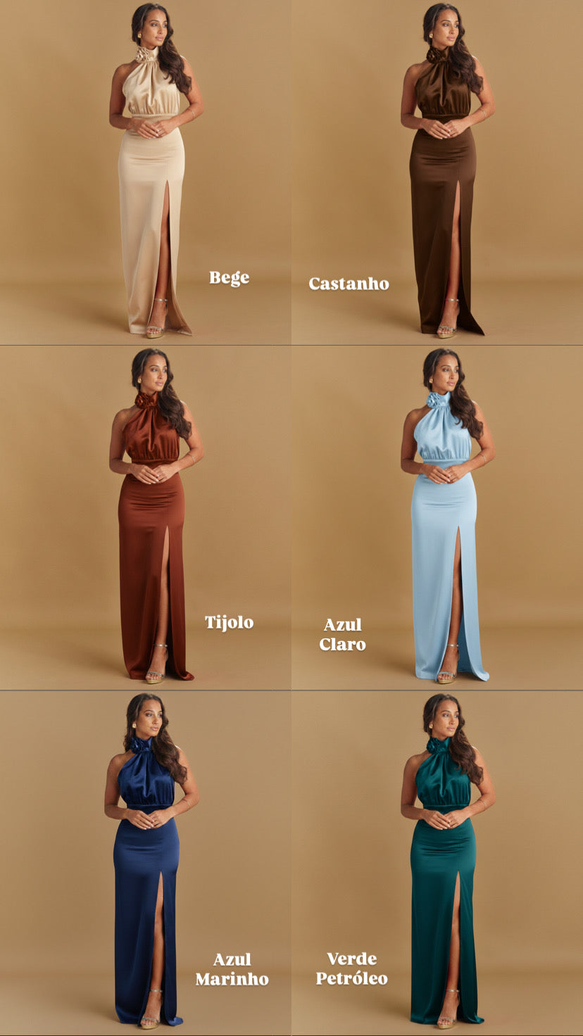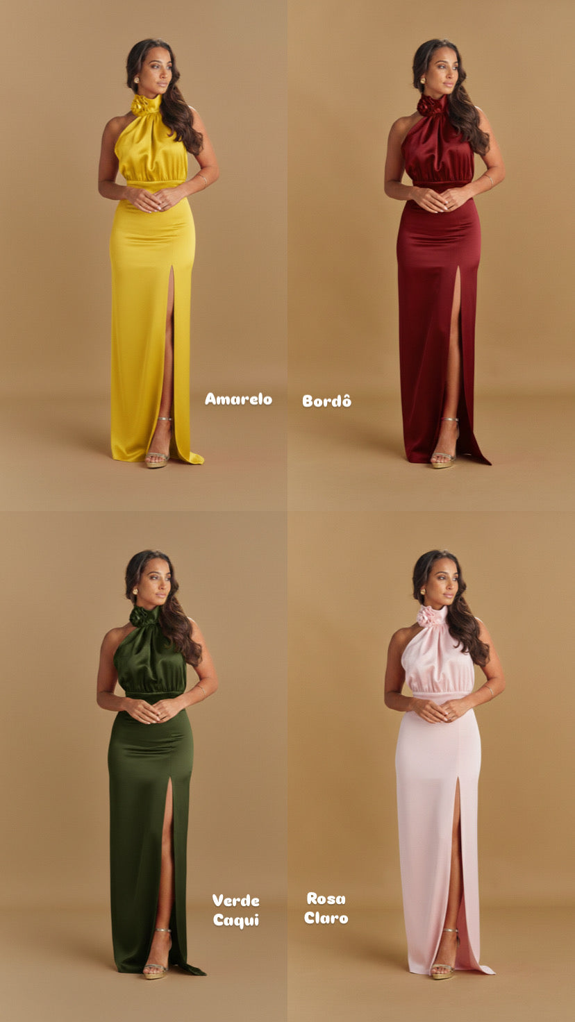Vestido comprido acetinado com gola halter. Possuí uma echarpe pregada na gola e aperta com botões forrados à cor. Possui uma flor removível na gola. Costas abertas. Saia em formato de tubo com racha lateral. Fecho invisível atrás.