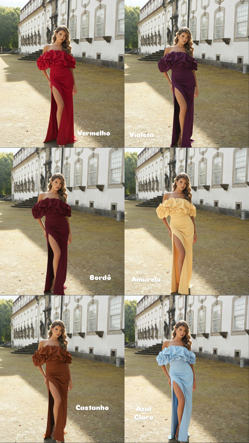Vestido comprido em tecido laguna com decote cai cai, revestido a tela e forro no peito. Possuí um folho no peito com elástico nos braços. A saia trespassa na lateral. Fecho invisível atrás.