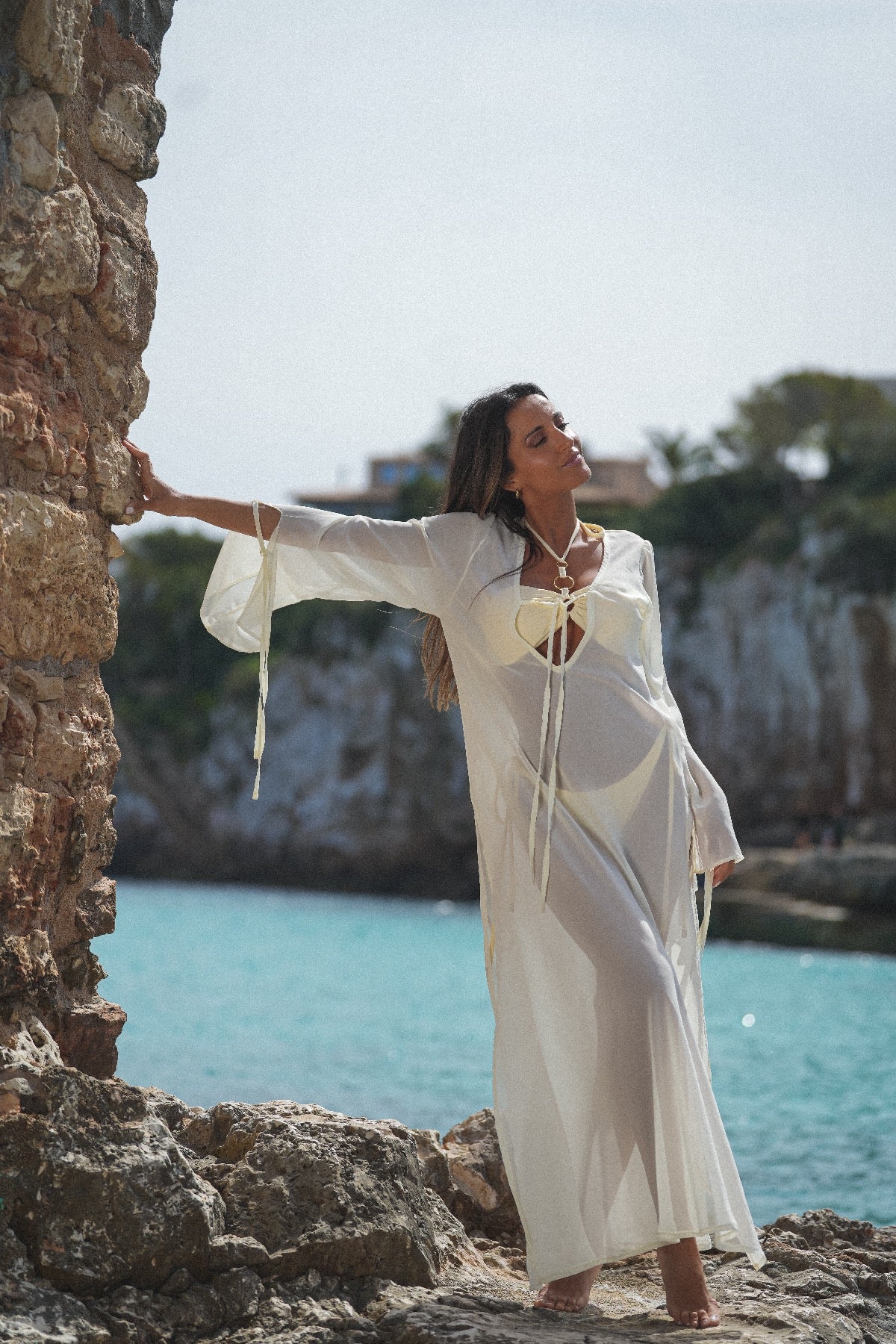 Long white transparent muslin dress with bell-bottom sleeves, tied at the cuff with two straps. Slight V-shaped neckline. It has slits on the sides. No clasp.