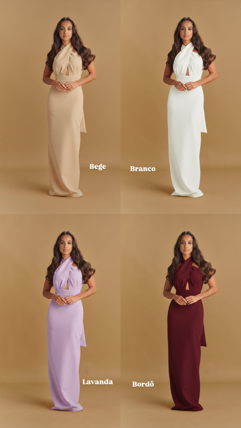 Vestido comprido com pormenor de duas tiras cruzadas ajustáveis no peito que apertam no pescoço. Costa abertas. Saia em formato de tubo com racha atrás. Fecho invisível atrás.