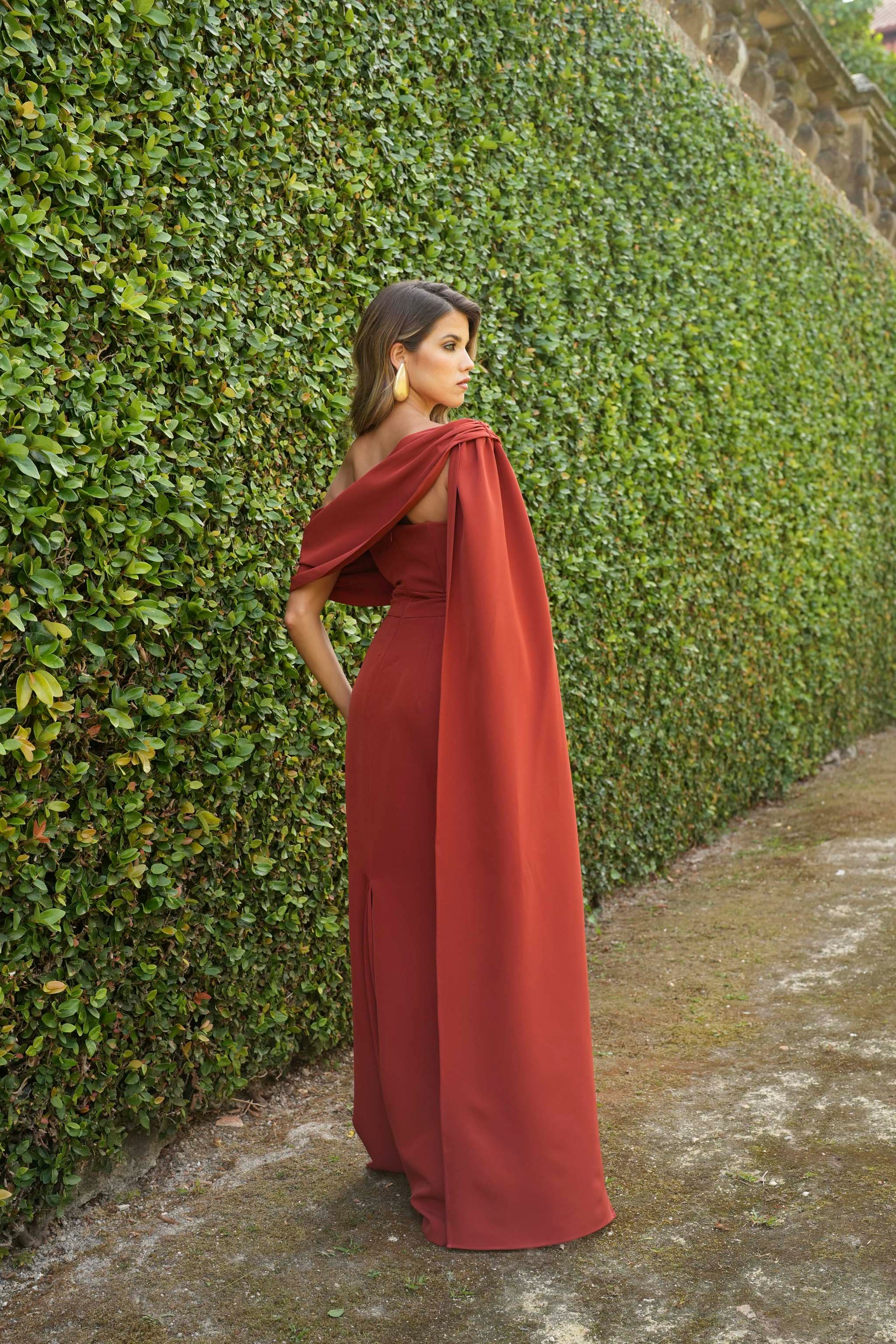 Vestido comprido em tecido laguna com decote cai cai revestido a tela, forro e varetas no peito. Saia em formato sereia com cauda atrás. Possuí uma echarpe estreita comprida do mesmo tecido. Fecho invisível atrás. Possuí uma capa.