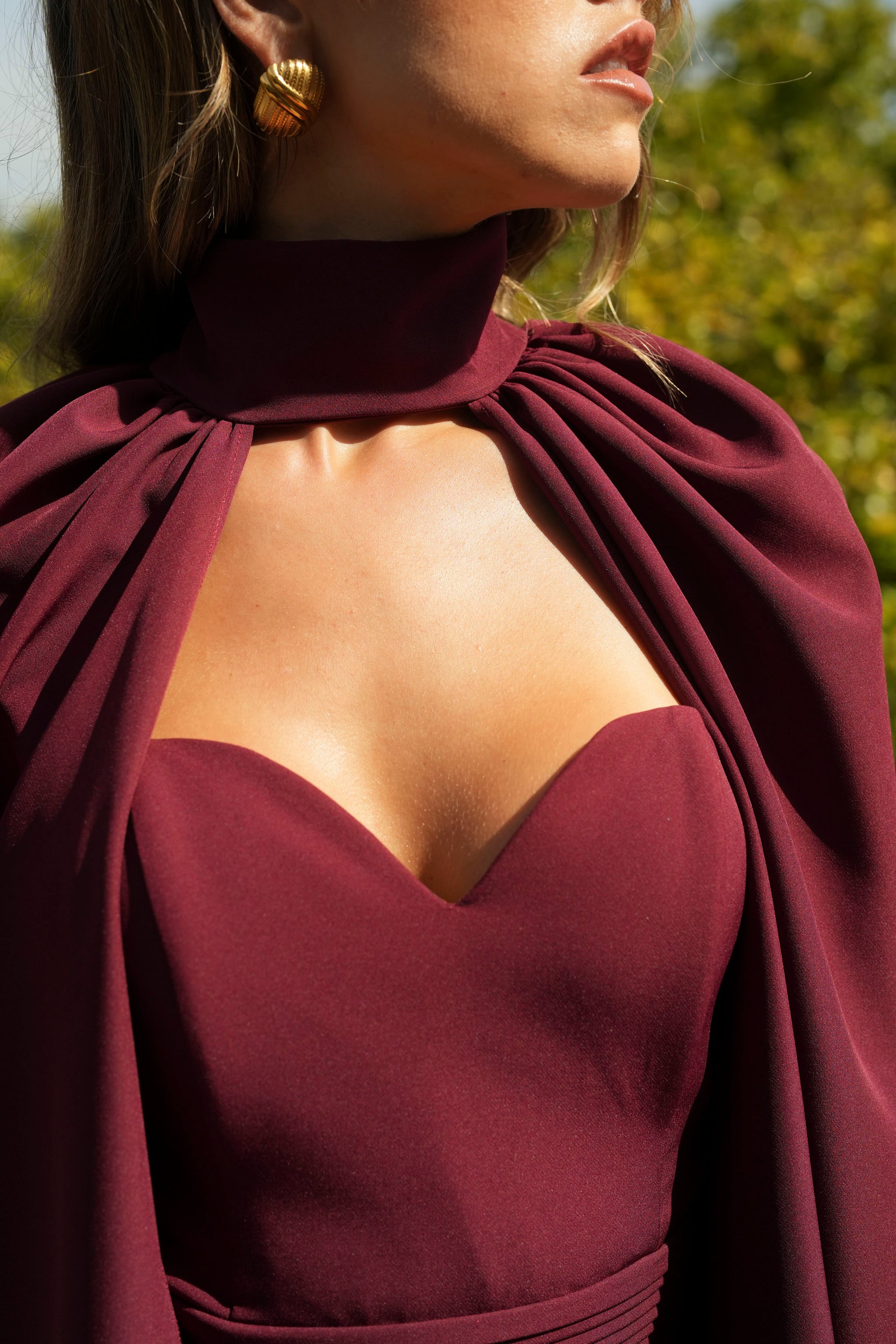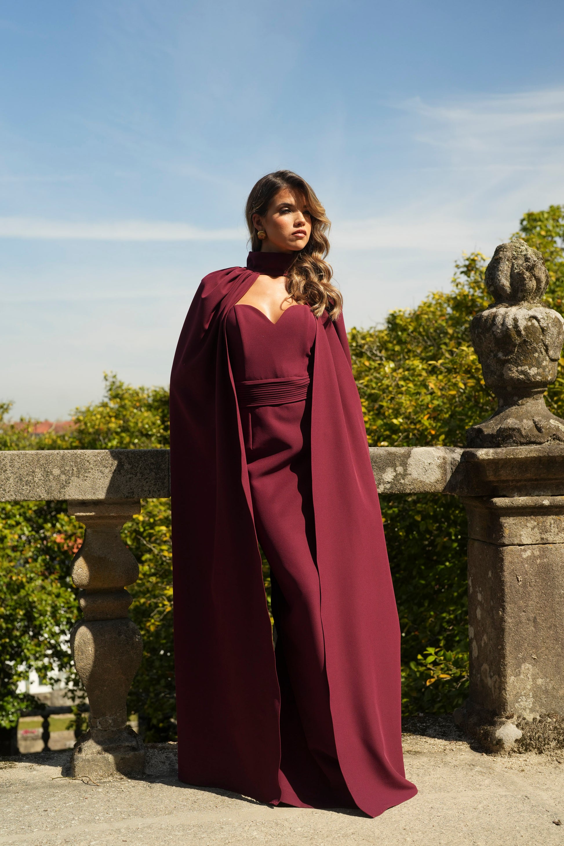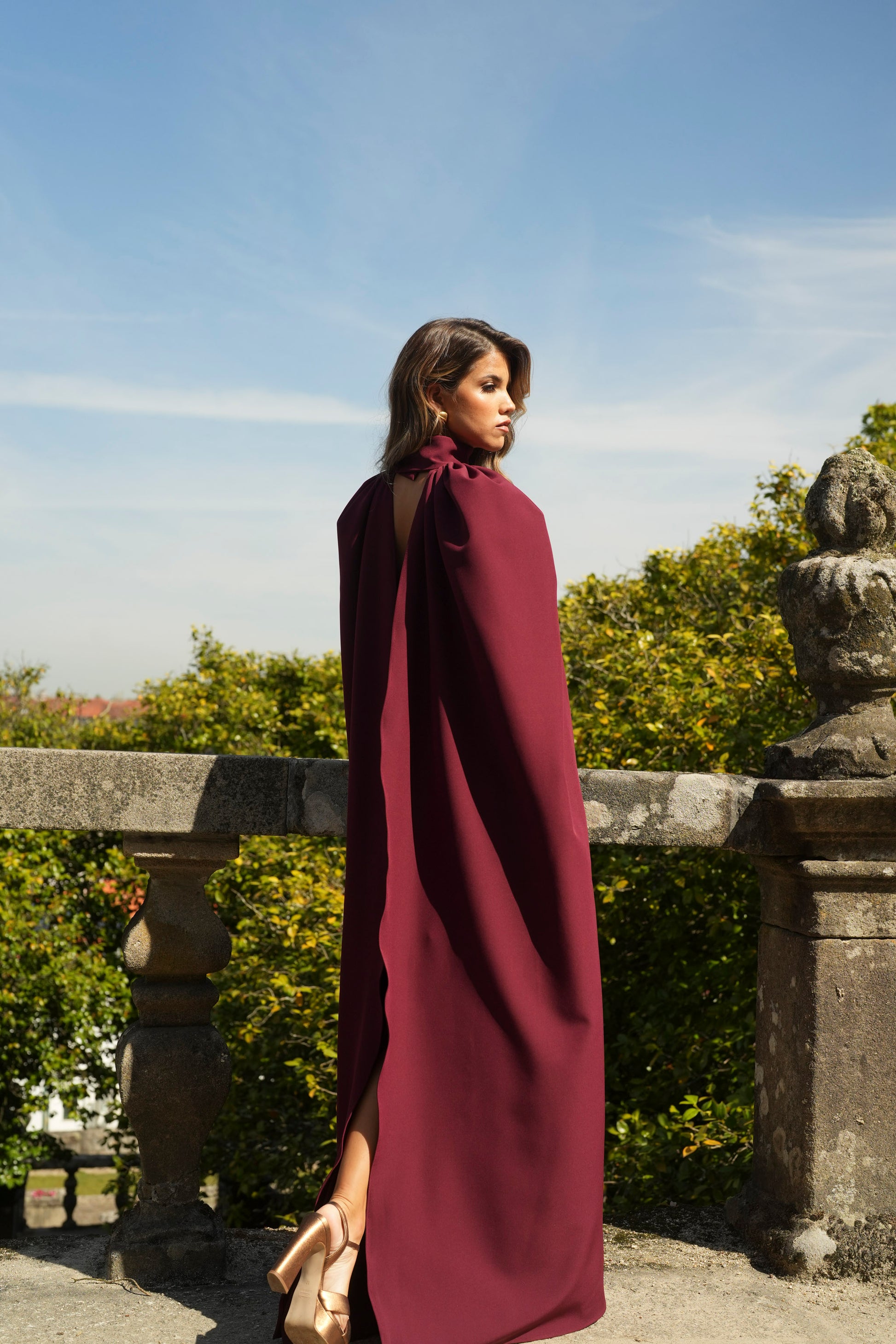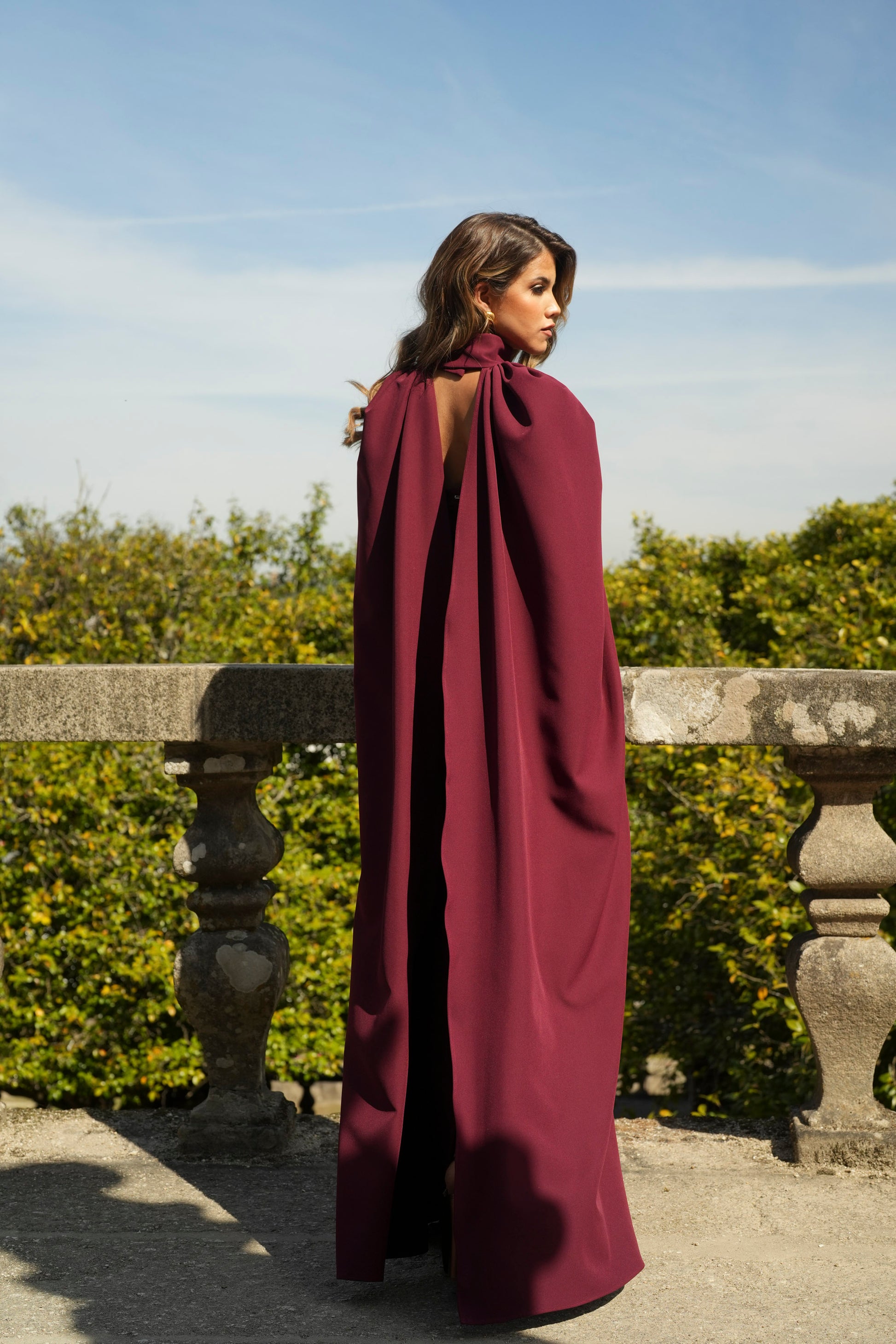Capa em tecido laguna com elasticidade com duas mangas compridas largas abertas. Possui uma gola que aperta atrás com botões forrados á cor.