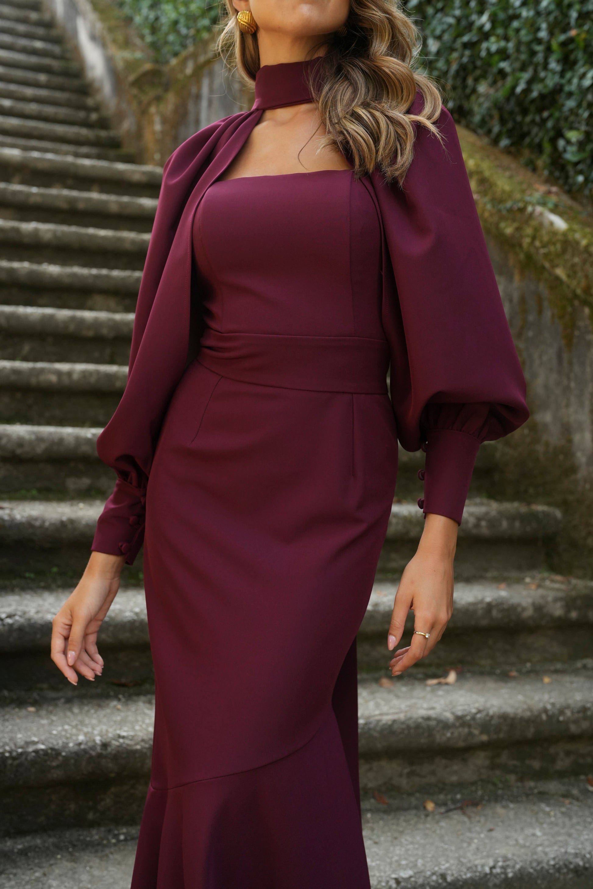 Capa em tecido laguna com elasticidade que possui duas mangas com uma gola que ata atrás com duas tiras compridas. Aperta no punho com botões forrados á cor.