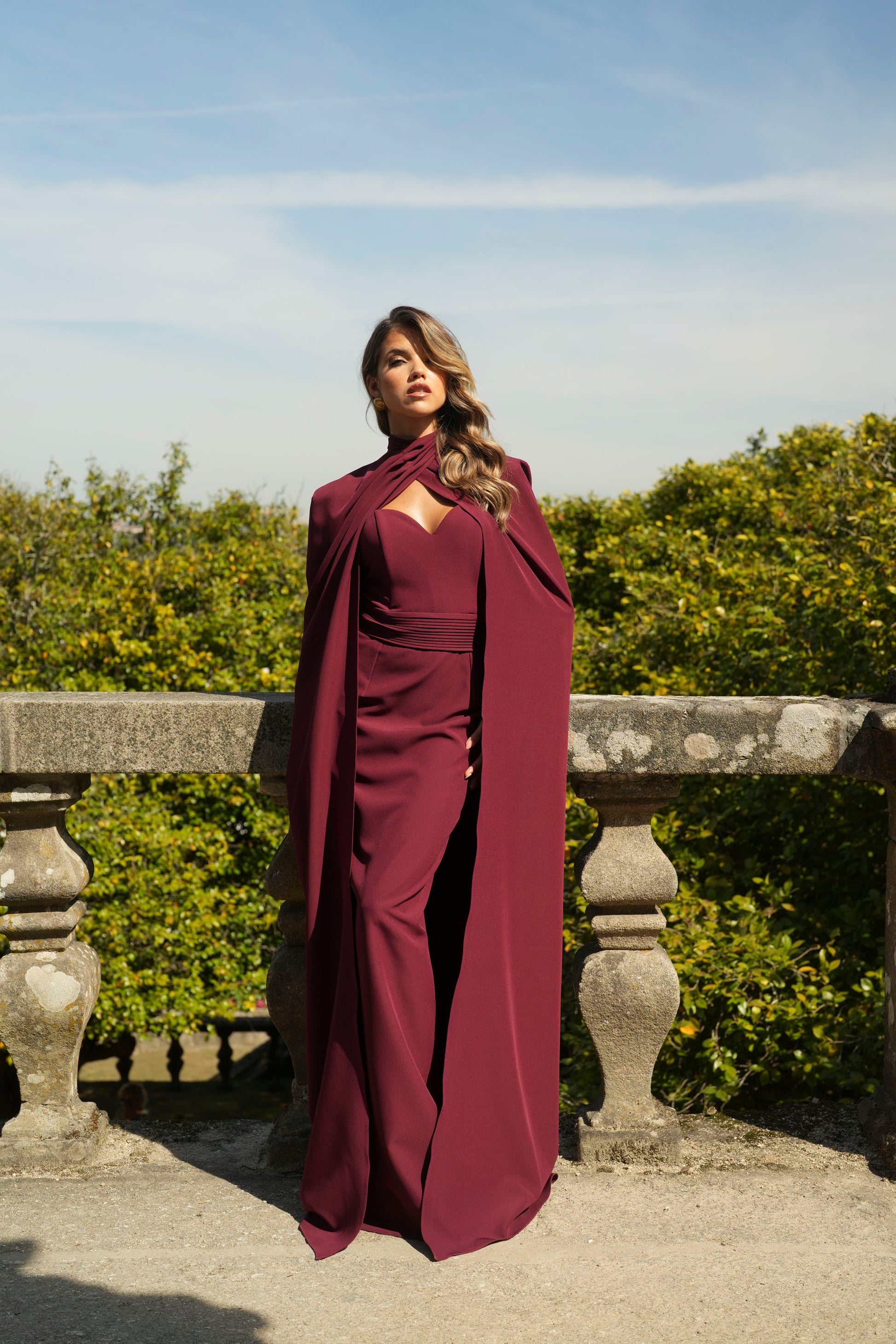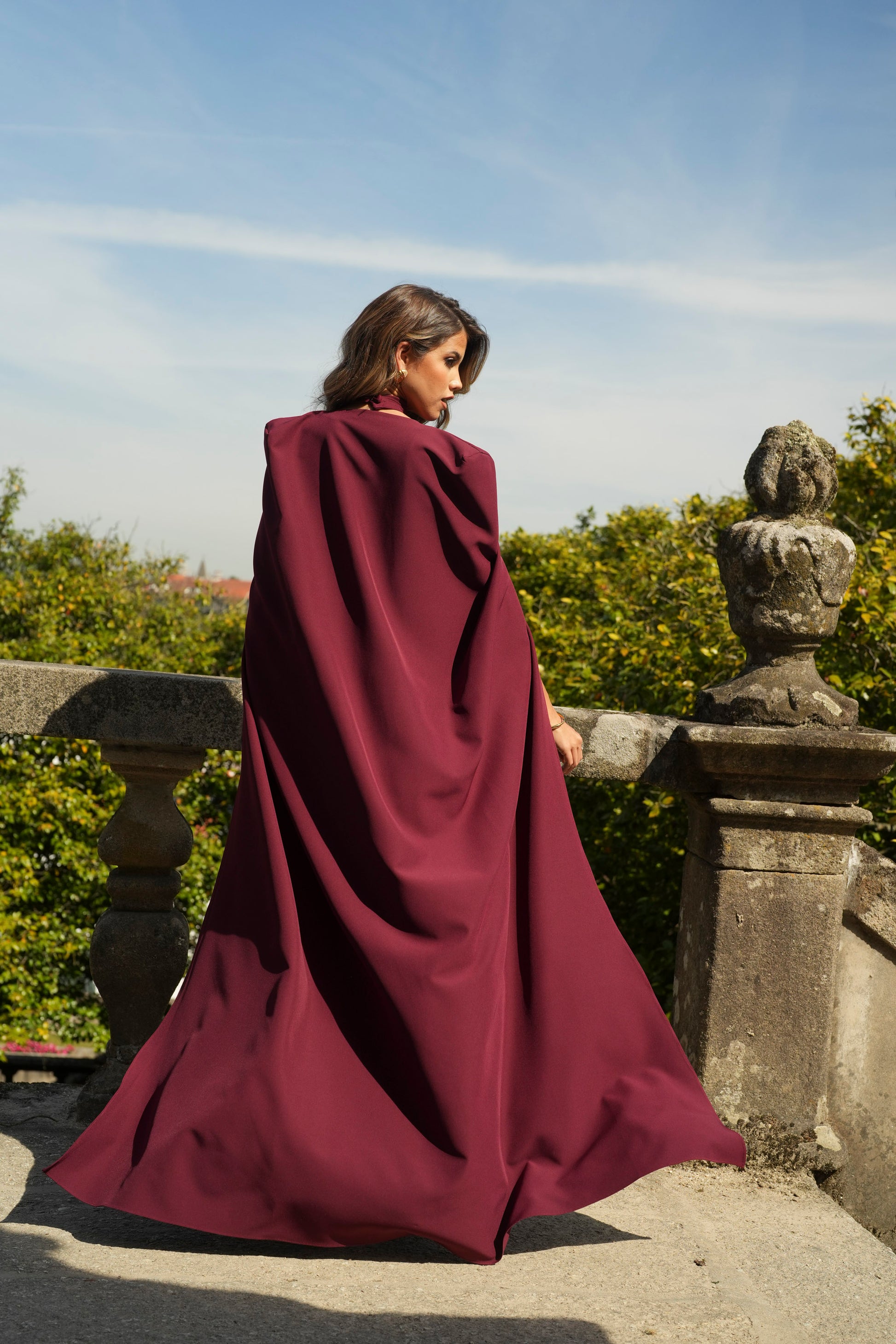 Capa em tecido laguna com elasticidade cruzada no pescoço. Aperta atrás com botões forrados á cor.