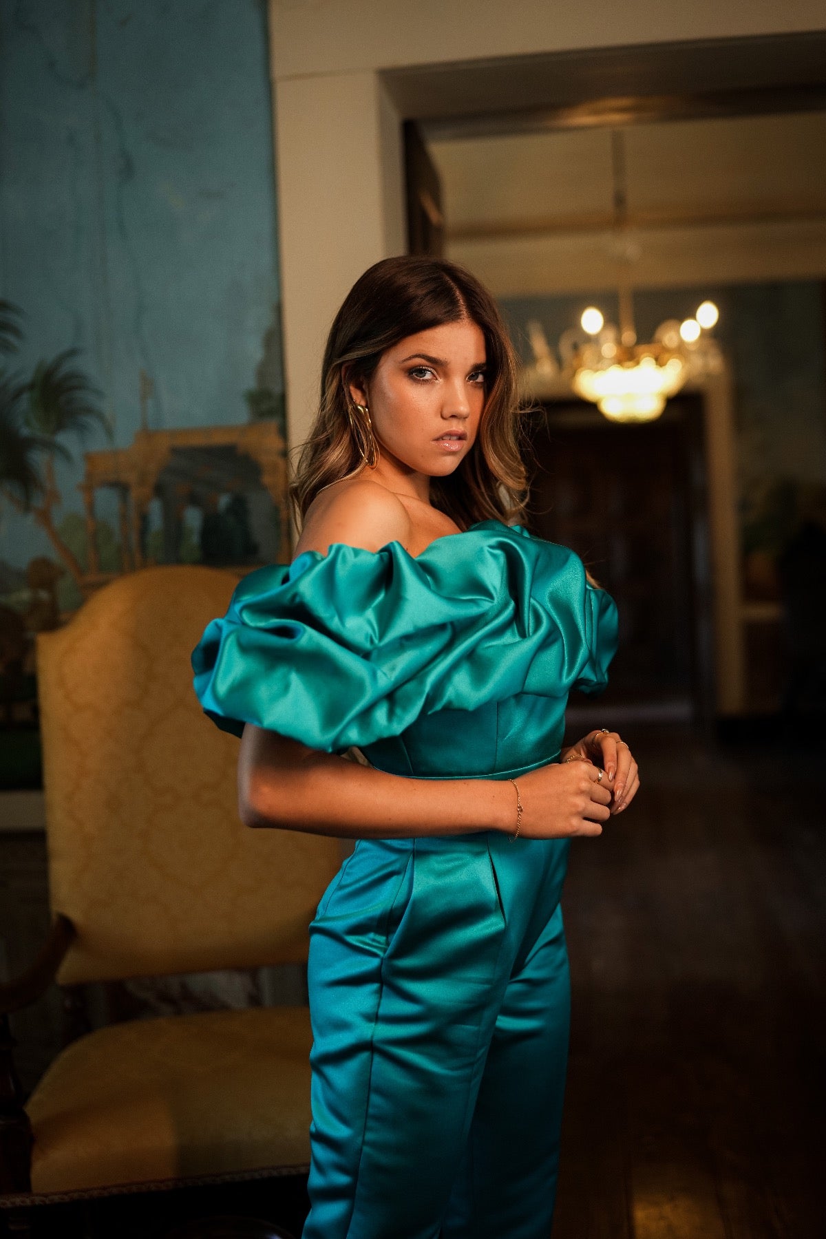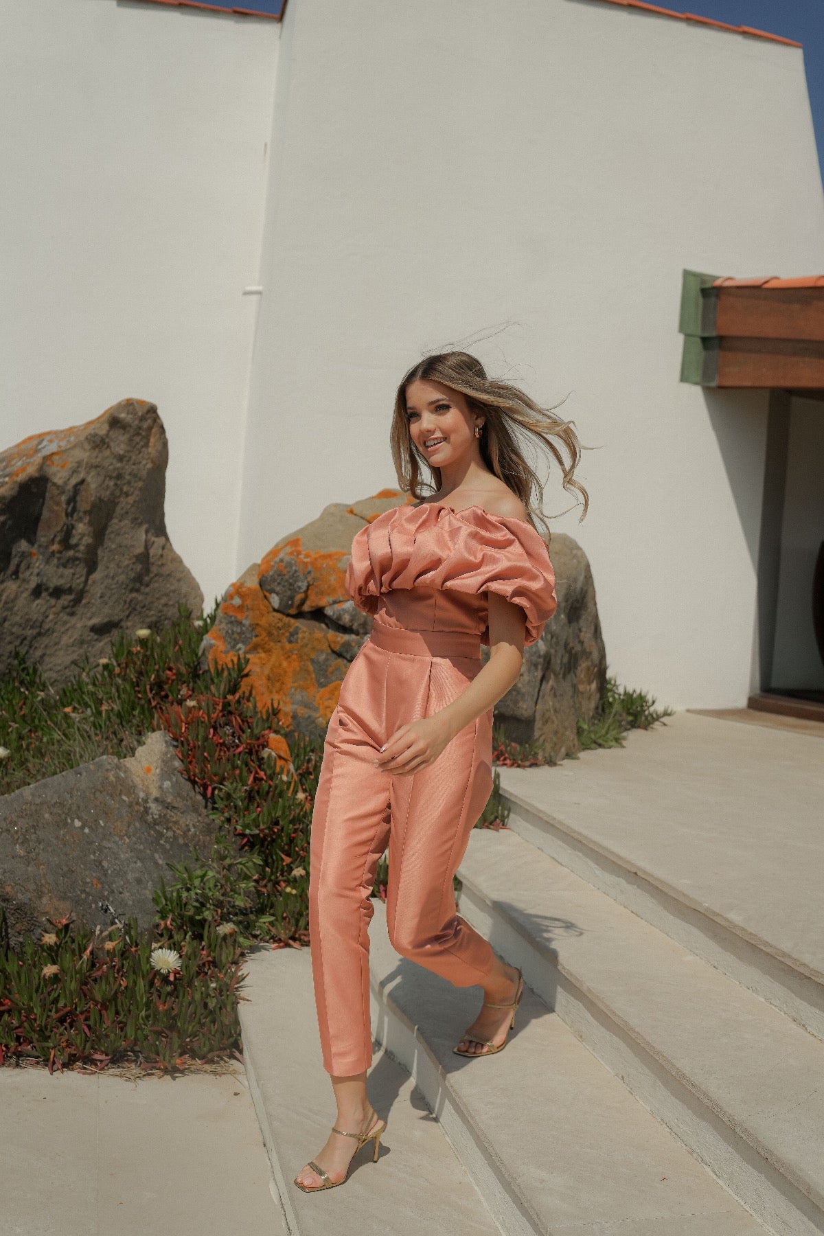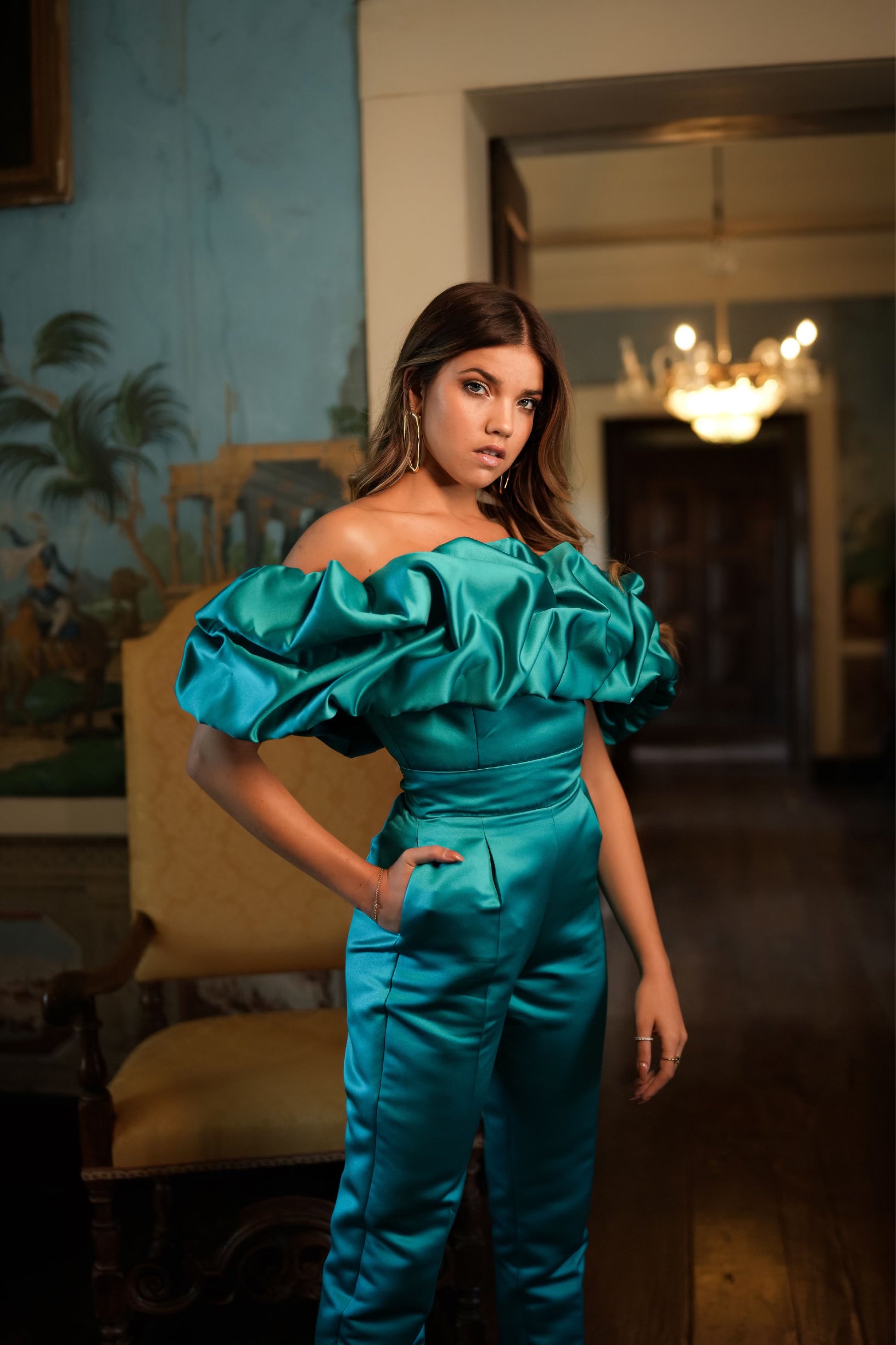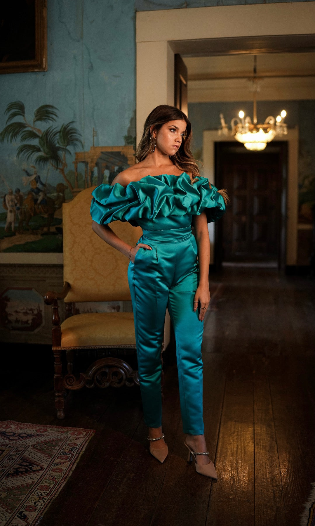 Macacão estruturado revestido a tela e forro no peito. Folho aplicado na zona do peito até às costas com elástico nos ombros. Fecho invisível atrás. Sem alças.