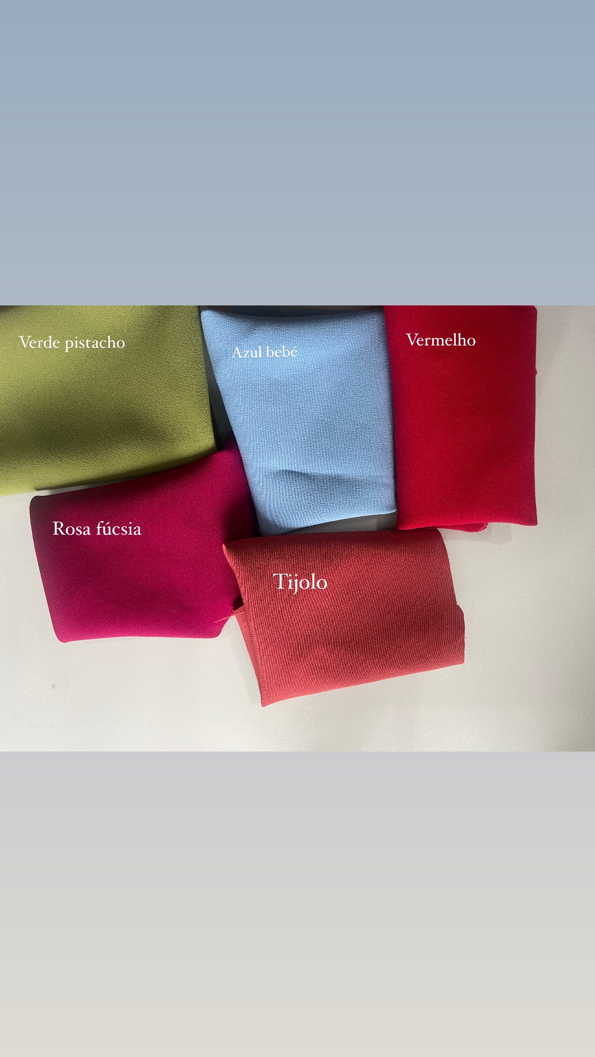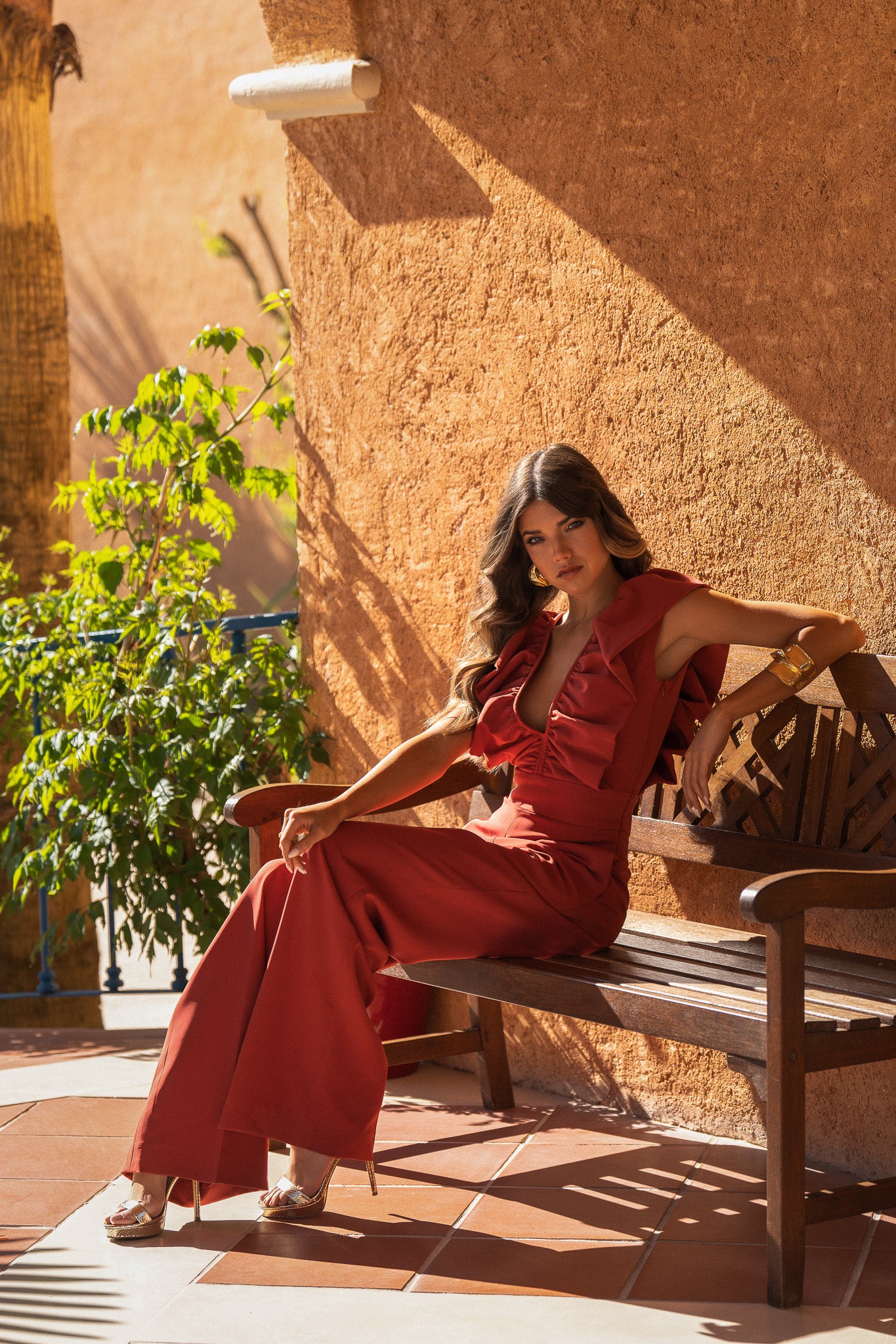 Macacao de cinrura alta e perna larga com bolsos laterais. Possuí um decote profundo com um folho no peito e nas costas. Fecho invisível na lateral.
