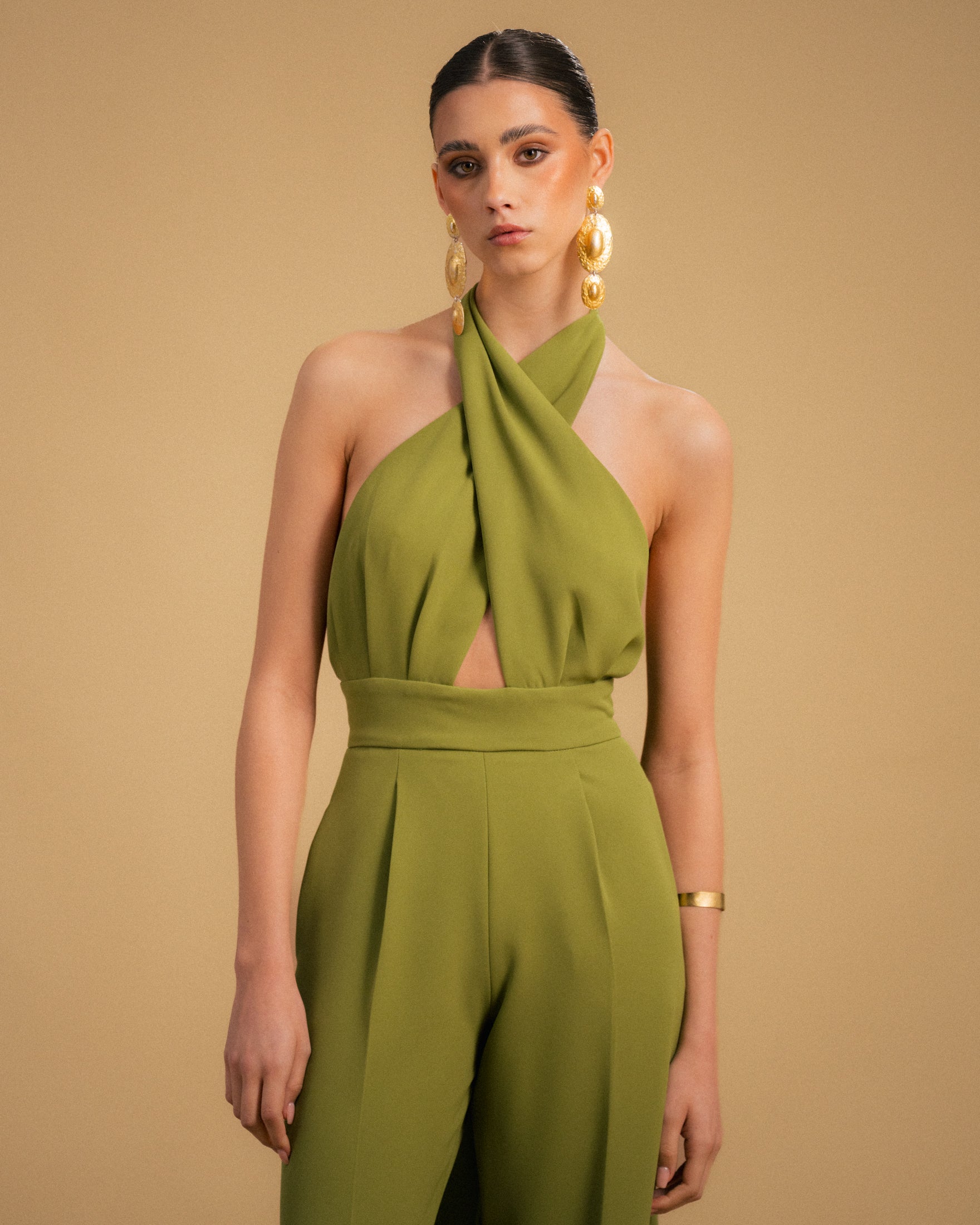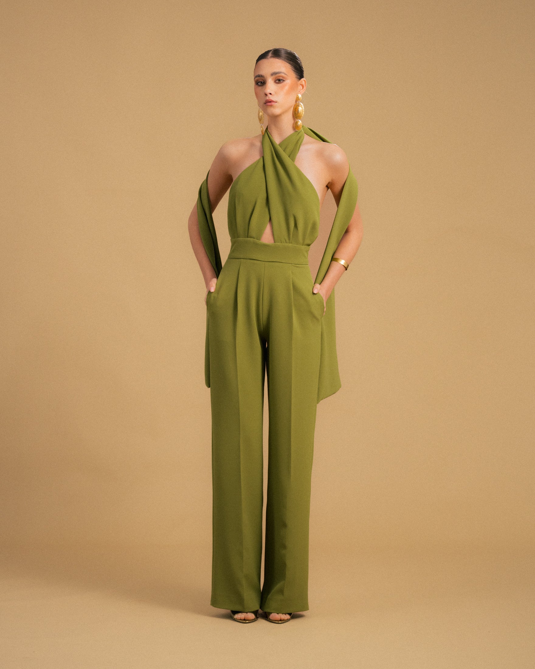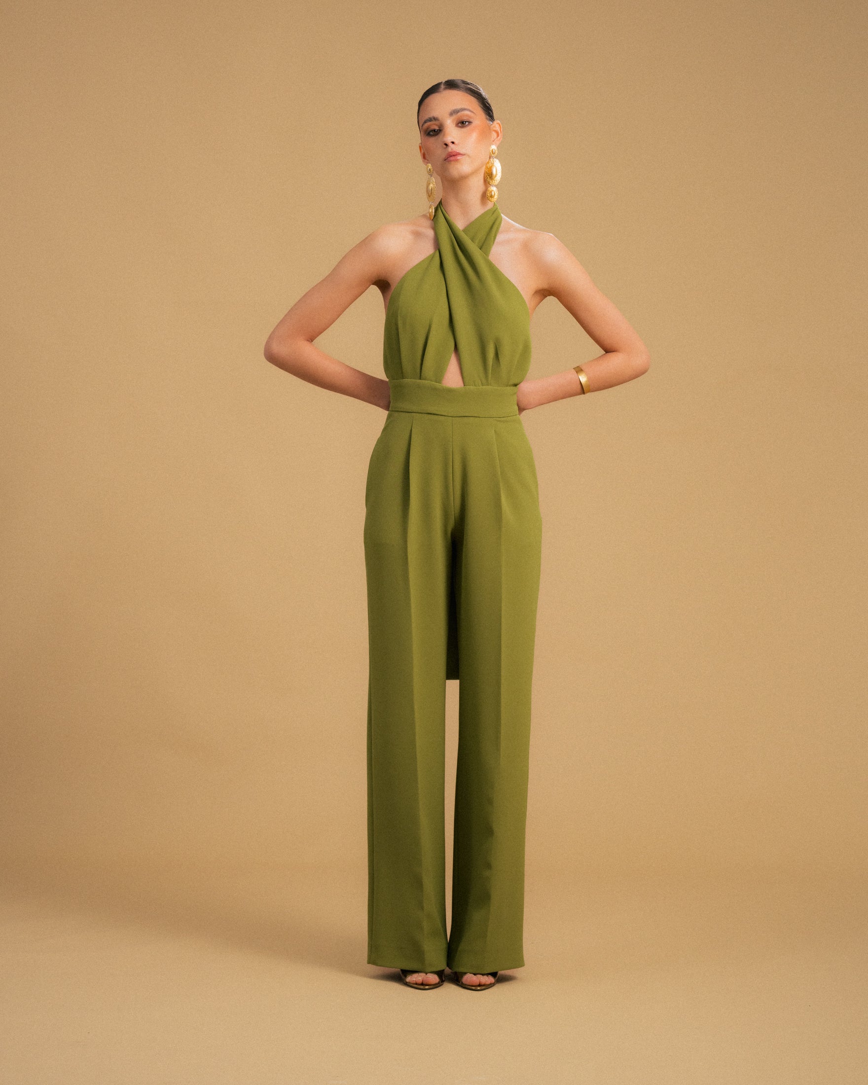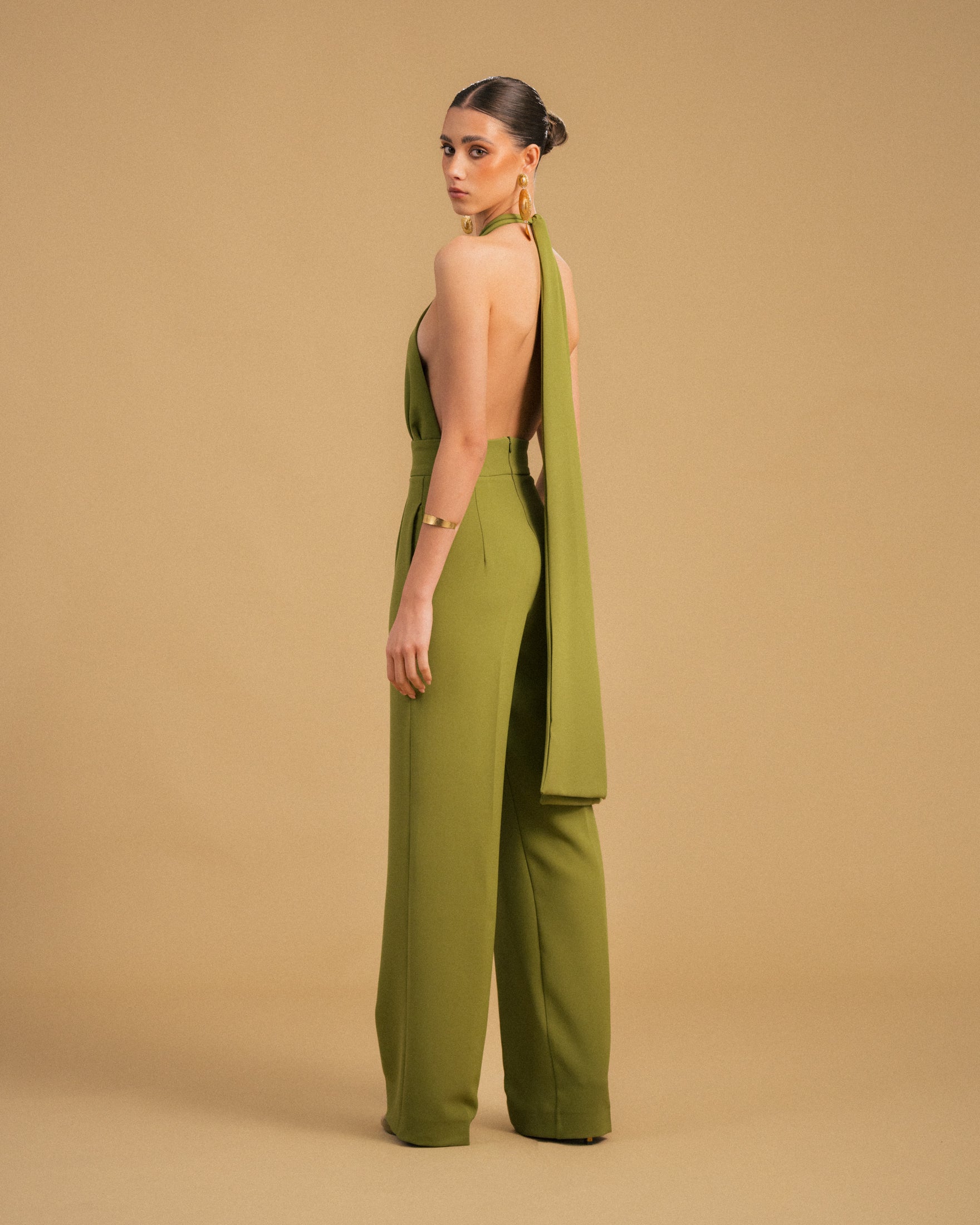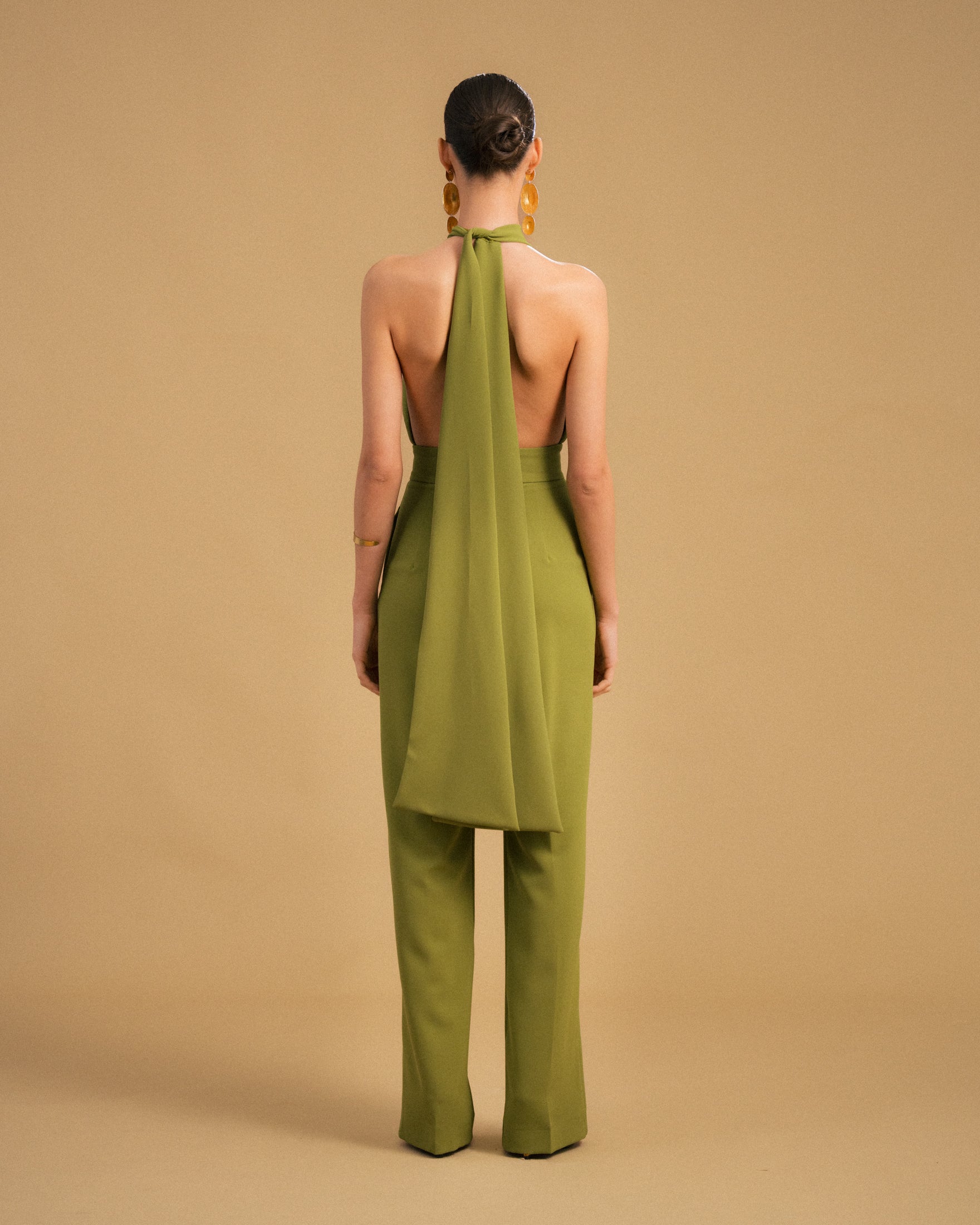 Macacão verde pistacho de perna larga e cintura subida com bolsos laterais. Possuí duas tiras ajustáveis no peito que apertam com um nó no pescoço. Costas abertas e fecho invisível atrás.