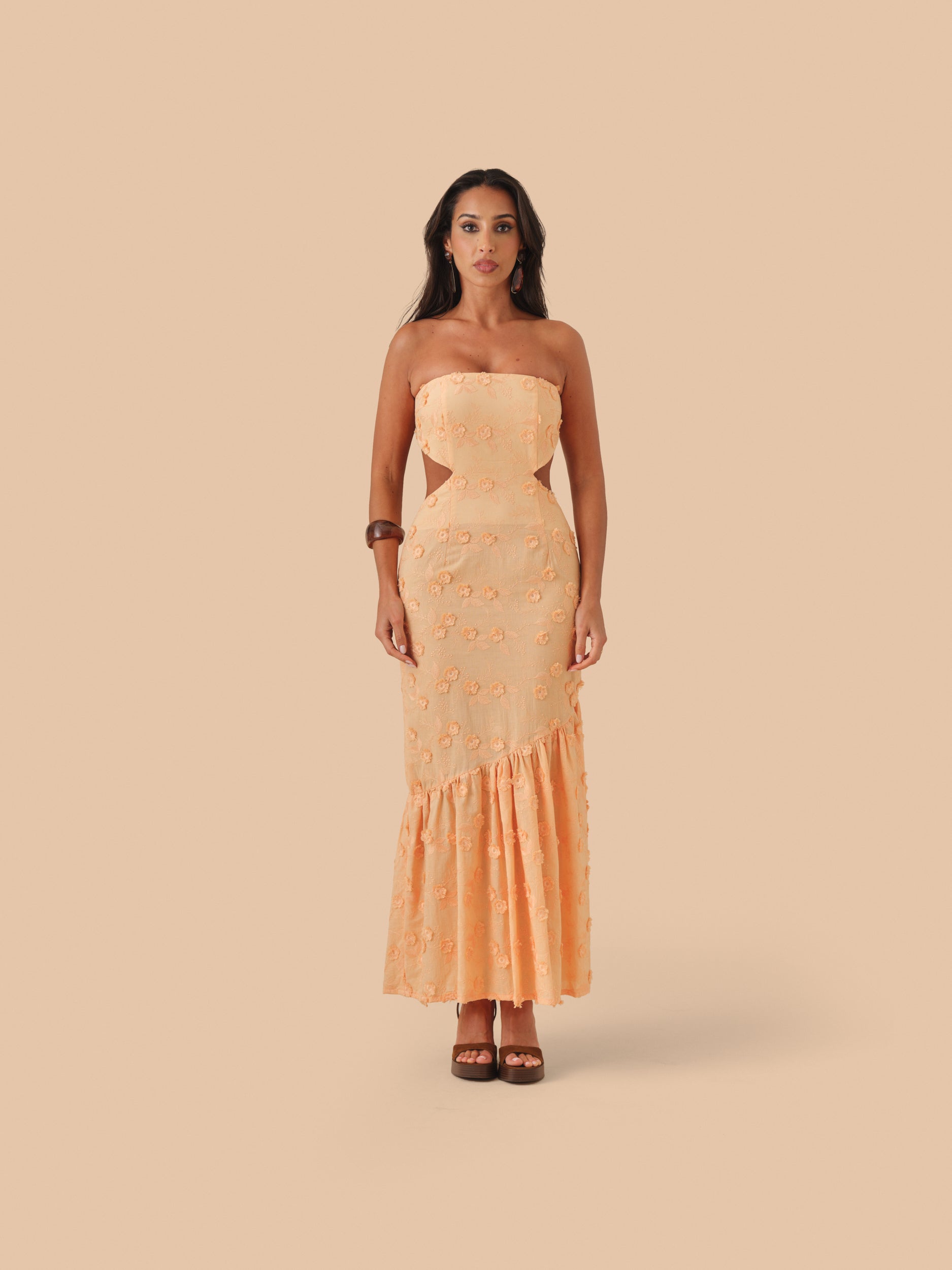 Vestido midi em tecido floral coral, todo forrado com tecido acetinado. Decote cai cai com aberturas laterais da cintura até às costas. Aperta atrás com botões forrados á cor. A saia possuí um folho franzido. Fecho invisível atrás.