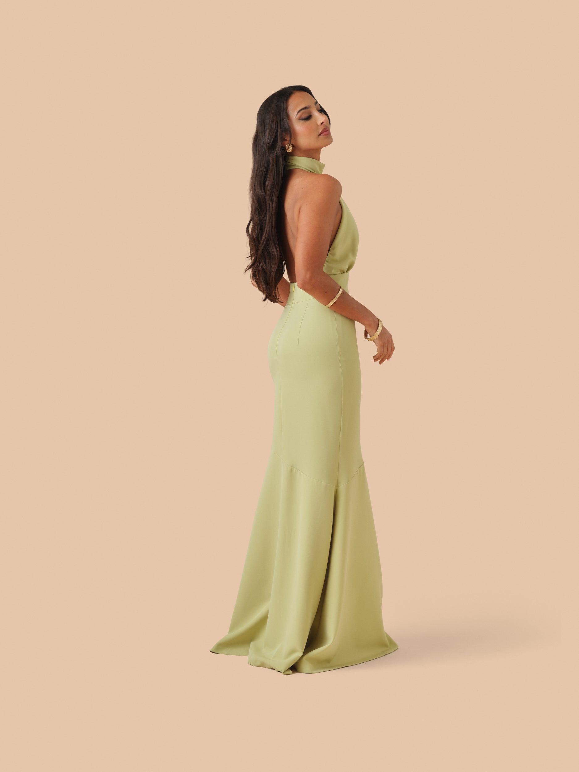 Vestido comprido em tecido laguna com elasticidade. Gola halter forrada que aperta no pescoço com botões forrados á cor. Saia comprida com um folho. Fecho invisível atrás.